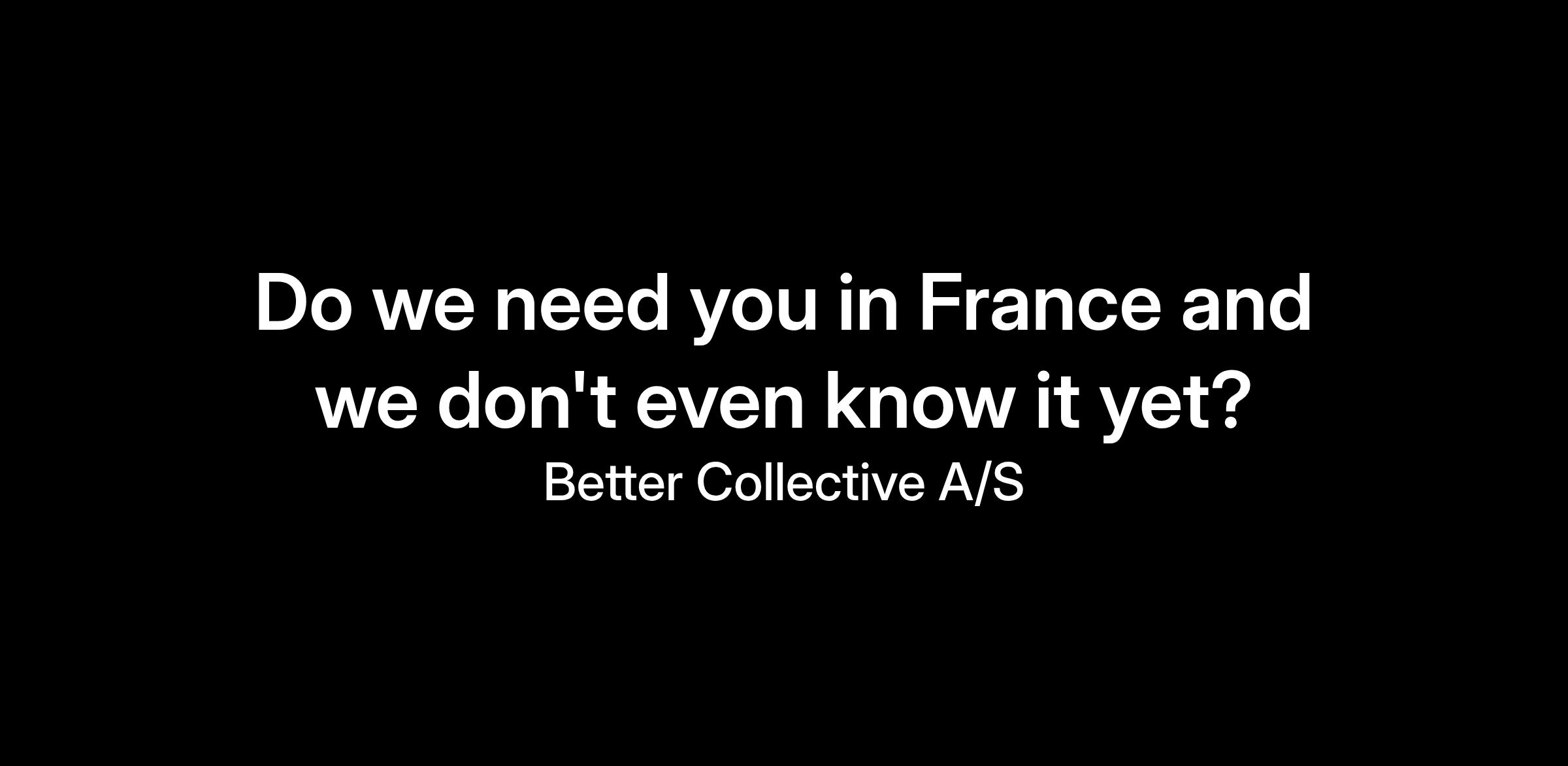 Thank you for visiting Better Collective. We're happy to know that you want to join our team and take part in our journey to become the leading digital sports media group. We always like to hear from you and if you did not find your dream job among our open positions do not hesitate to send us an unsolicited application.
