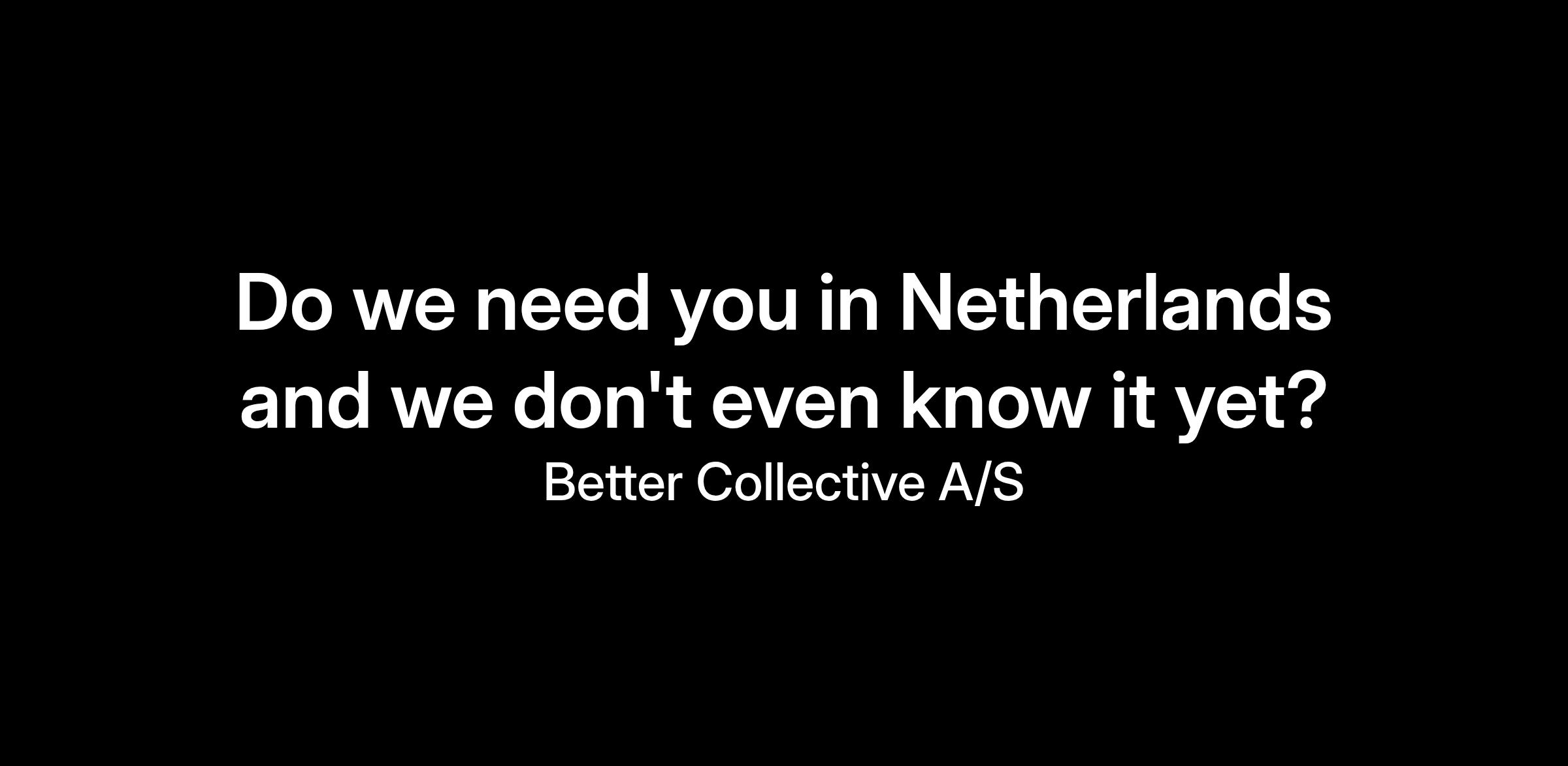 Thank you for visiting Better Collective. We're happy to know that you want to join our team and take part in our journey to become the leading digital sports media group. We always like to hear from you and if you did not find your dream job among our open positions do not hesitate to send us an unsolicited application.