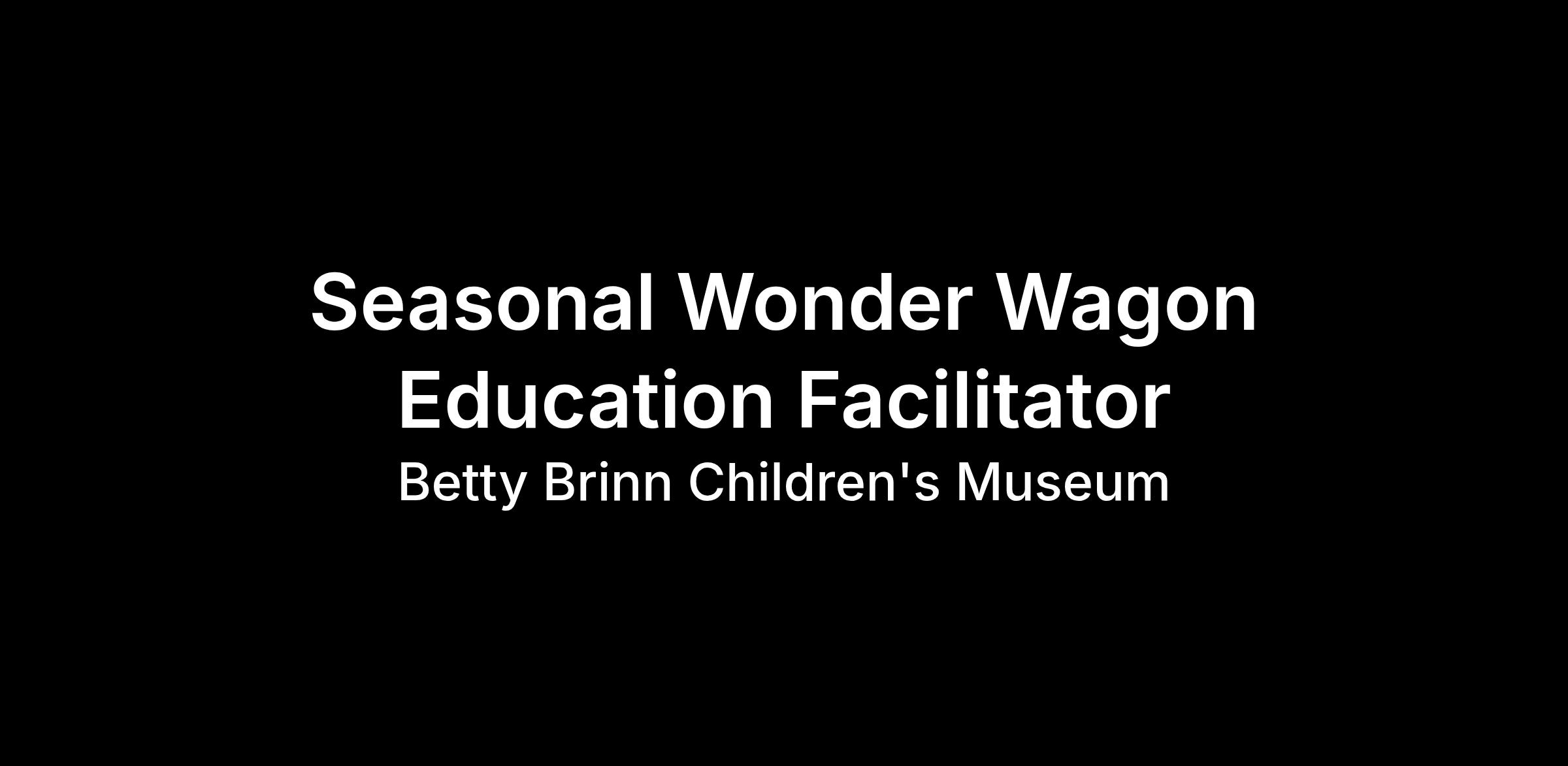 The Seasonal Wonder Wagon Education Facilitator is responsible for delivering engaging, high-quality off-site learning experiences through the Betty Brinn Children’s Museum’s Wonder Wagon program. This role serves as the primary facilitator for Wonder Wagon events, traveling to community events, neighborhood gatherings, and festivals across Milwaukee to bring hands-on, play-based learning directly to children and families.